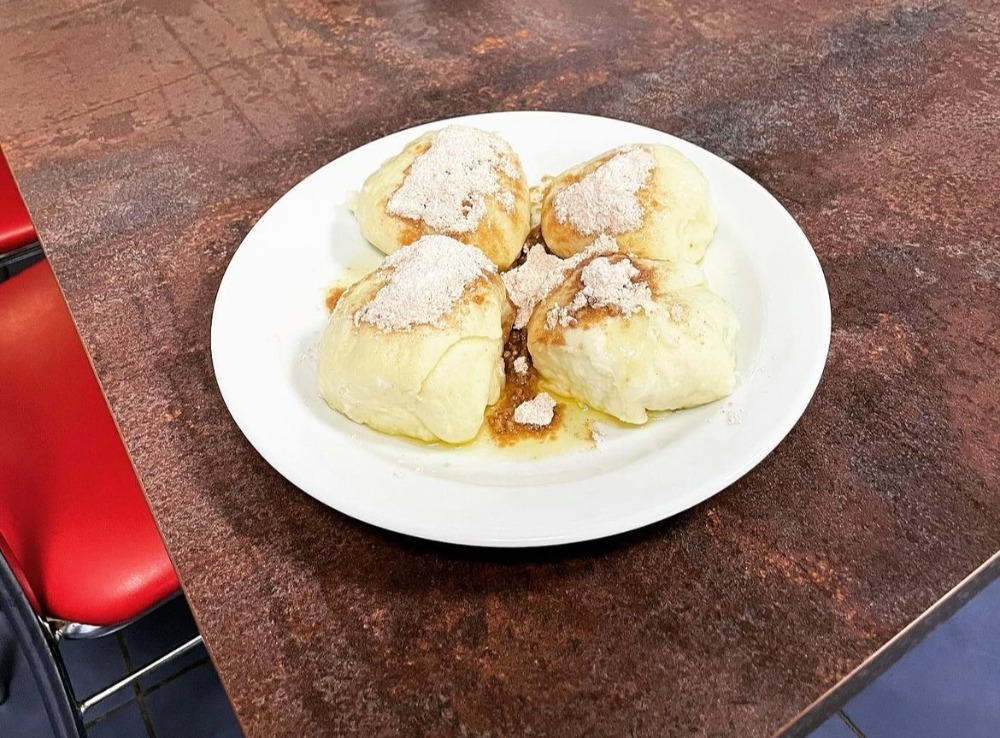 Domácí kynutý knedlík plněný jahodami, máslo a cukr 155,-