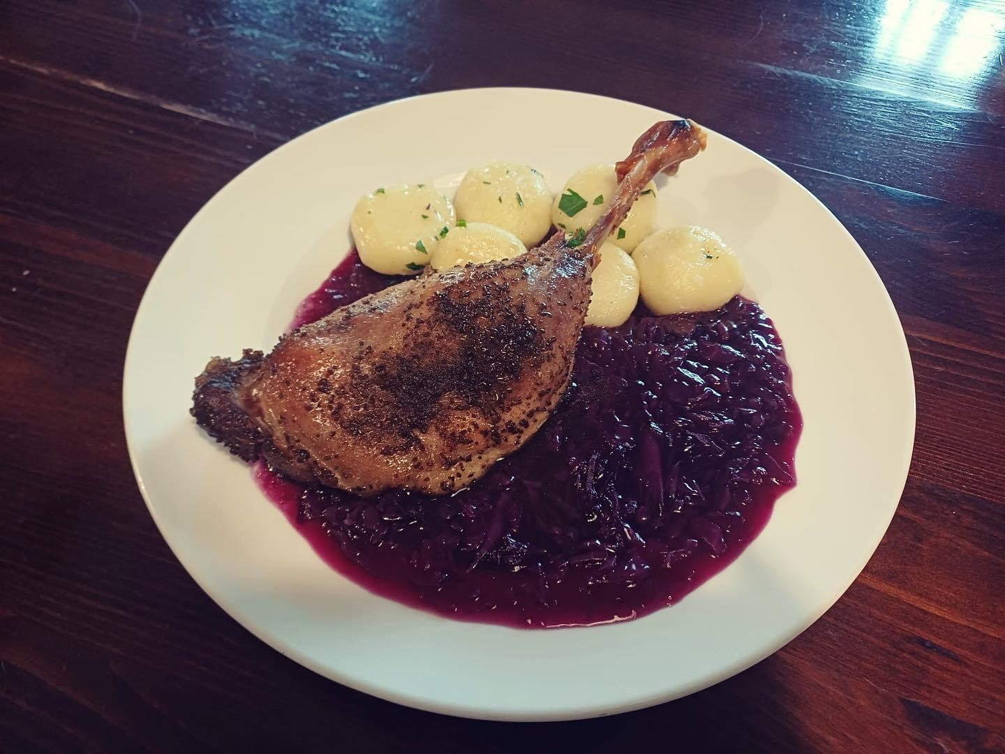 Pečené kachní stehno s červeným zelím a domácím bramborovým knedlíkem 275,-