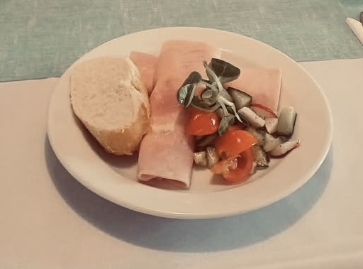 Šunková rolka plněná krabím pyré s červenou šalotkou, pečivo 95,-